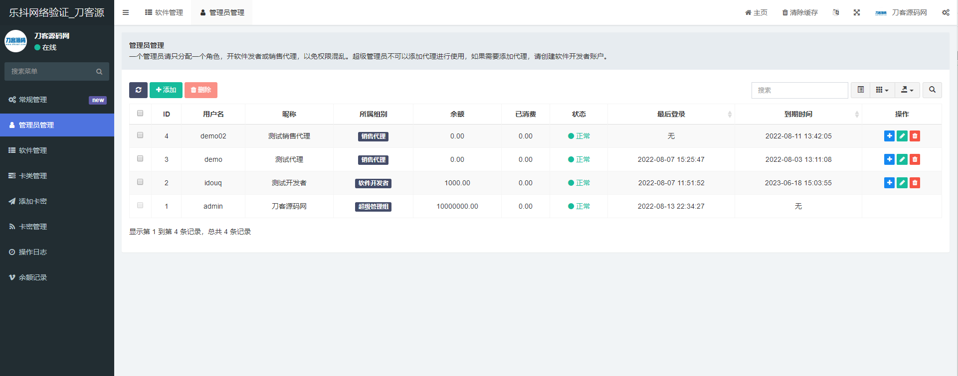 支持代理系统,支持代理到期时间设置,支持充值,扣款,封禁
