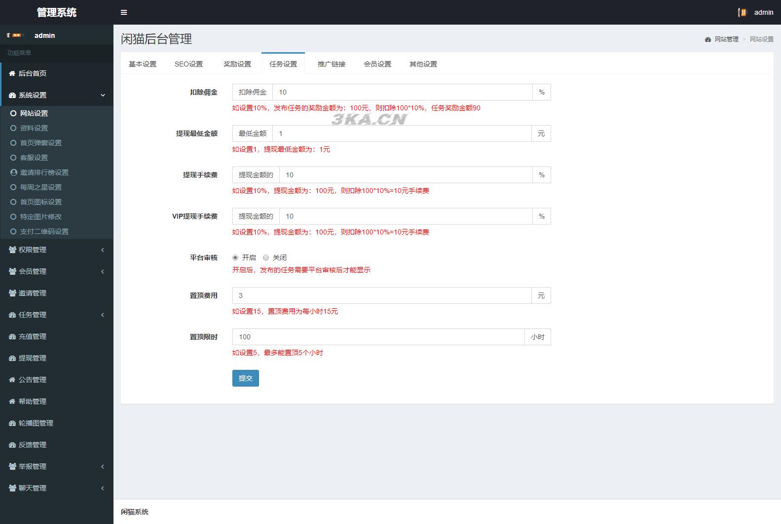 5、后台添加任务分类,可设置分类图片、发布任务的最低金额、会员领取任务的等级。