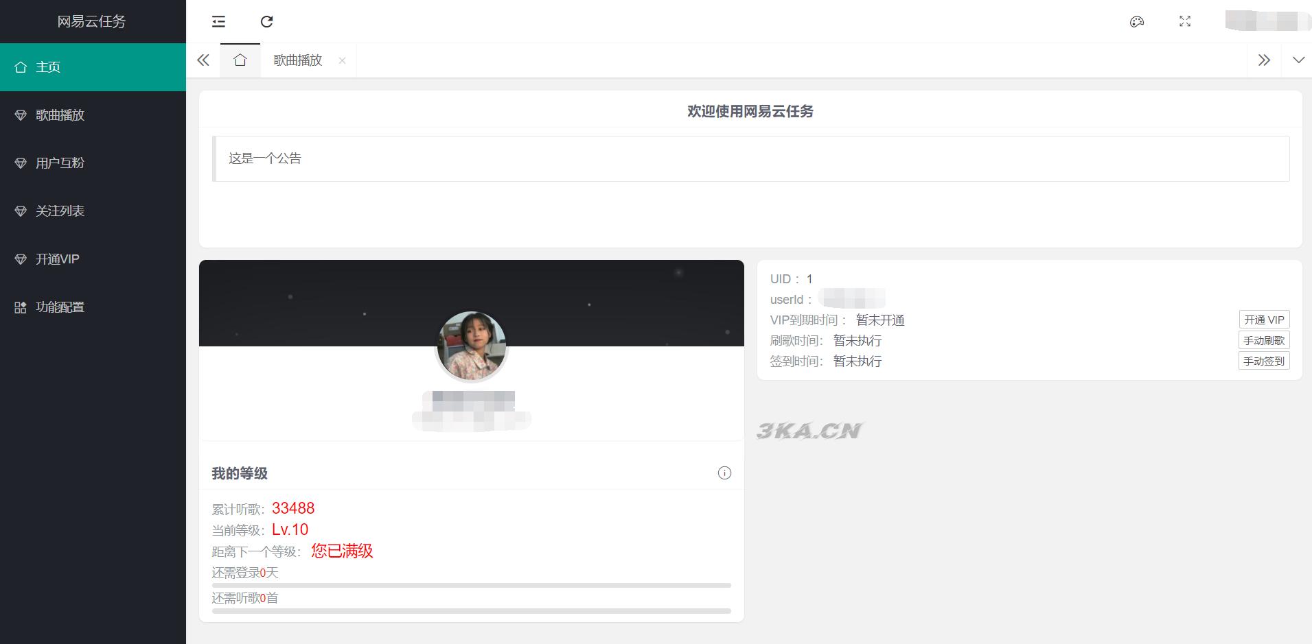 支持充值 会员使用 每日签到打卡任务 刷歌曲播放 刷粉丝等