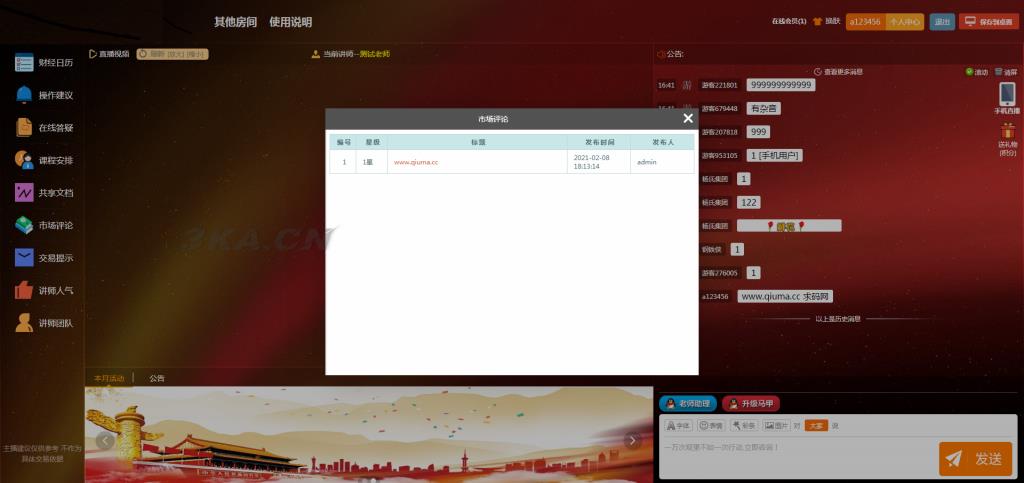 源码附带了直播软件可以直接对接地址,也可以调用各主流视频流,或者组合视频源,通过视频可以直观的进行实时的行情讲解或技术分析,有利于让游客更加清晰的理解。
