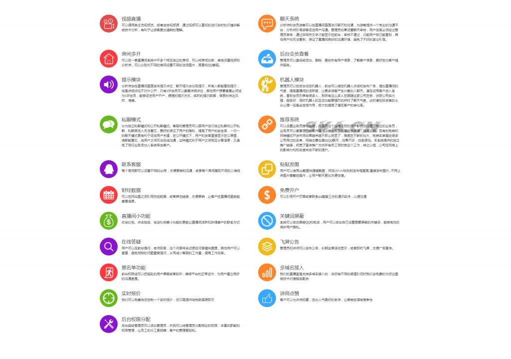 聊天审核/喊单提醒/客户管理/素材更换/讲师包装/水军操作/课件下载/观点发布/聊天互动/观看直播/联系客服/公告展示等