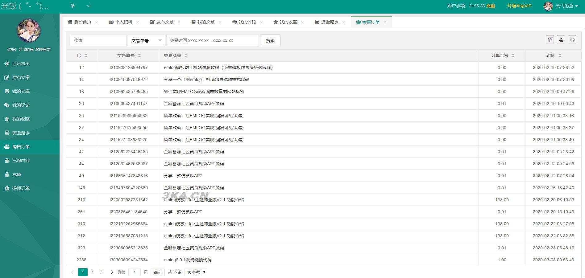 销售订单:已购买文章的订单