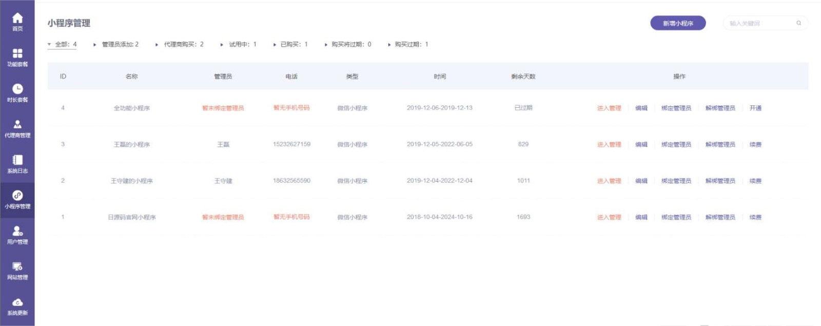 代理商管理:拥有底层源码系统,发展自己的代理商,列表清晰展示各代理商状态,详细设置对代理商账号信息、创建小程序的个数、系统到期时间等进行管理。