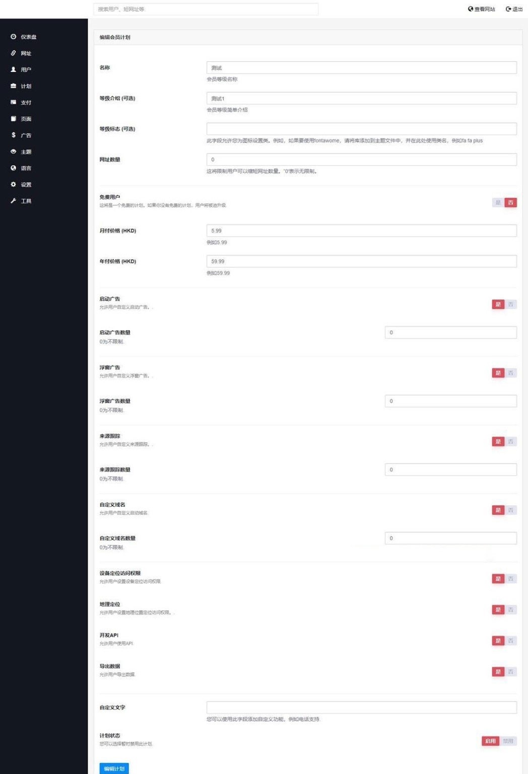 高级 URL 缩写附带成员资格模块,允许用户升级到付费计划,以便访问高级功能,如自定义初始页面、叠加页面、像素定位或您选择提供高级功能。付款由 Stripe 安全供电,除非取消,否则会自动计费。您可以从管理面板轻松定义价格并选择所有相关选项。