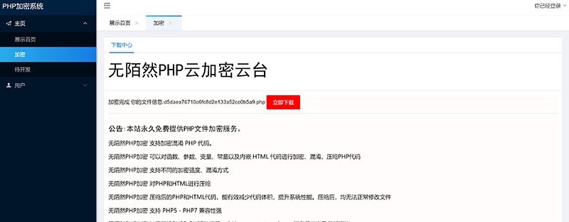 使用本加密,用户需要注册登录之后才能使用本加密,登录之后用户可自行上传PHP文件进行加密,加密成功之后即可下载,